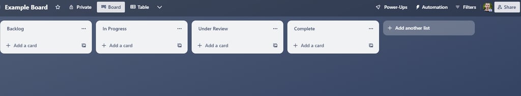 Columns (called lists in Trello) represent the workflow that your projects go through. Consider the main phases of each project. Projects usually start in a backlog. Work is assigned or taken and the team works on the project. The project might need to go through a review process before it can be considered complete.