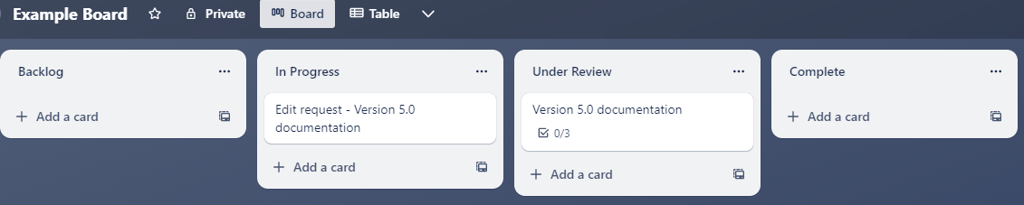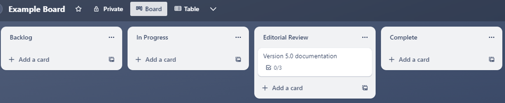 Add additional columns for the most important steps in your project workflow. For example, if you are a content developer and your content needs both a standard editorial review and a legal review, you can add a 'Legal Review' column to your board.