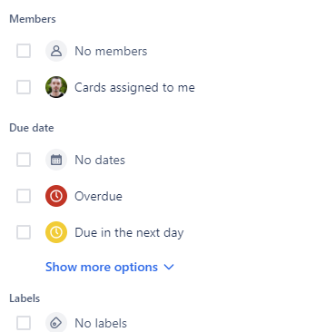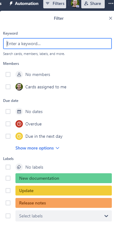 After adding projects to your board, you can label cards with a specific category. Labels and other card information, like members, can be used to filter cards on the board. This is useful when there are many projects on a single board.