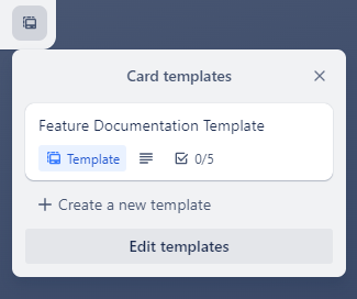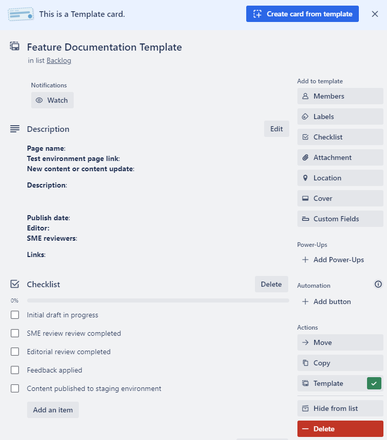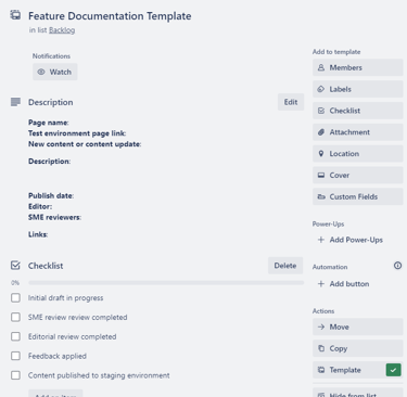 Information from the template will be copied into each card you create using the template. When the requestor creates a new Feature Documentation request, they will create a new card with this template and then fill out the empty fields in the description.