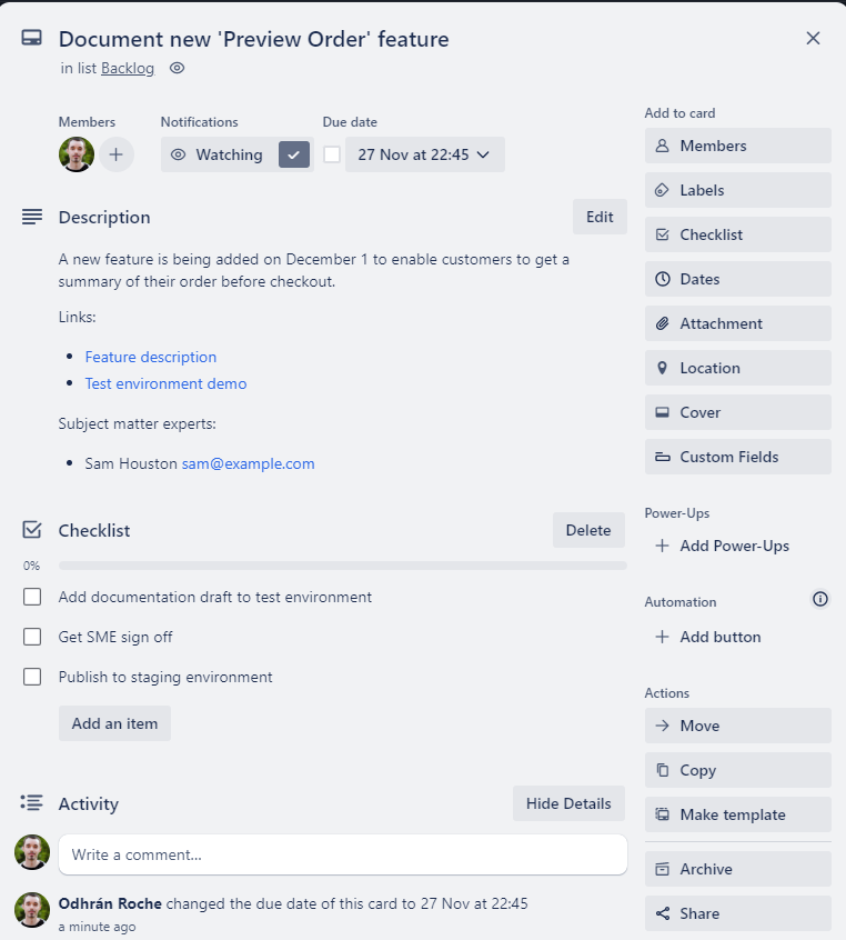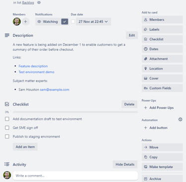 It's good to consider what type of information you want to track in your projects. In Trello, projects are described by cards. Each card is a project. The title is the only mandatory field in a Trello card, but other default options are useful, such as: